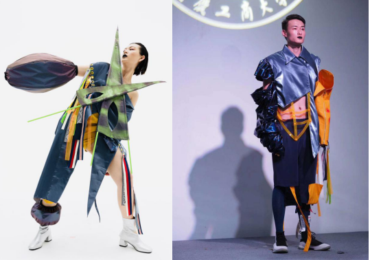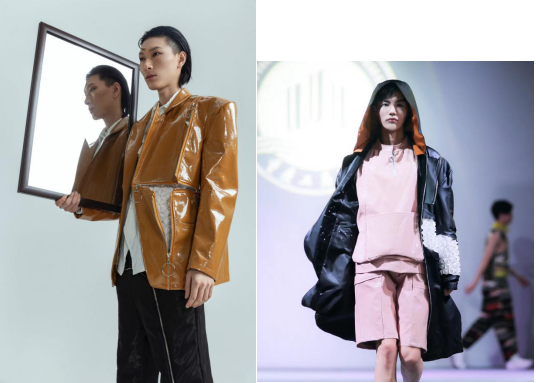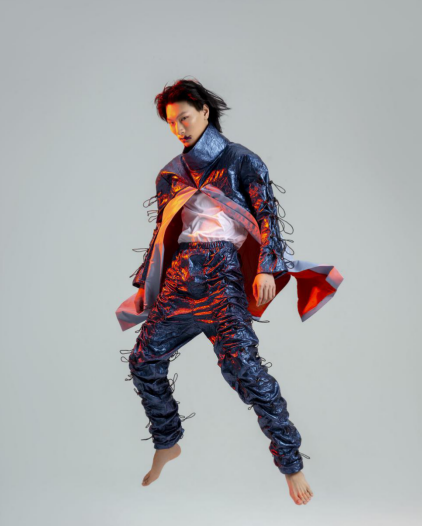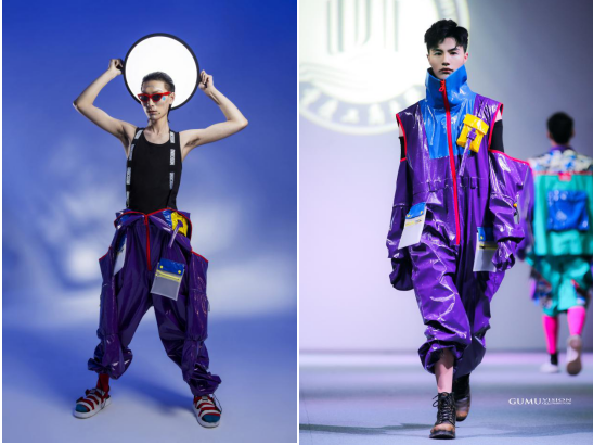 蒸汽波文化与时尚街头文化相结合,运动元素与工装复古潮流趋势,以科技感的面料与废弃快递包装袋相结合,循环利用,把可持续发展的环保理念应用于服装设计中,融合街头运动趋势的自然演变,诠释另一种未来感。