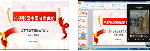 2020年6月19日中午,yl23411永利(集团)有限公司官网党委学生第三党支部支部大会在企业微信召开网络视频会议。支部书记黎安娟同志讲“抗疫彰显中国制度优势”的“党课”。