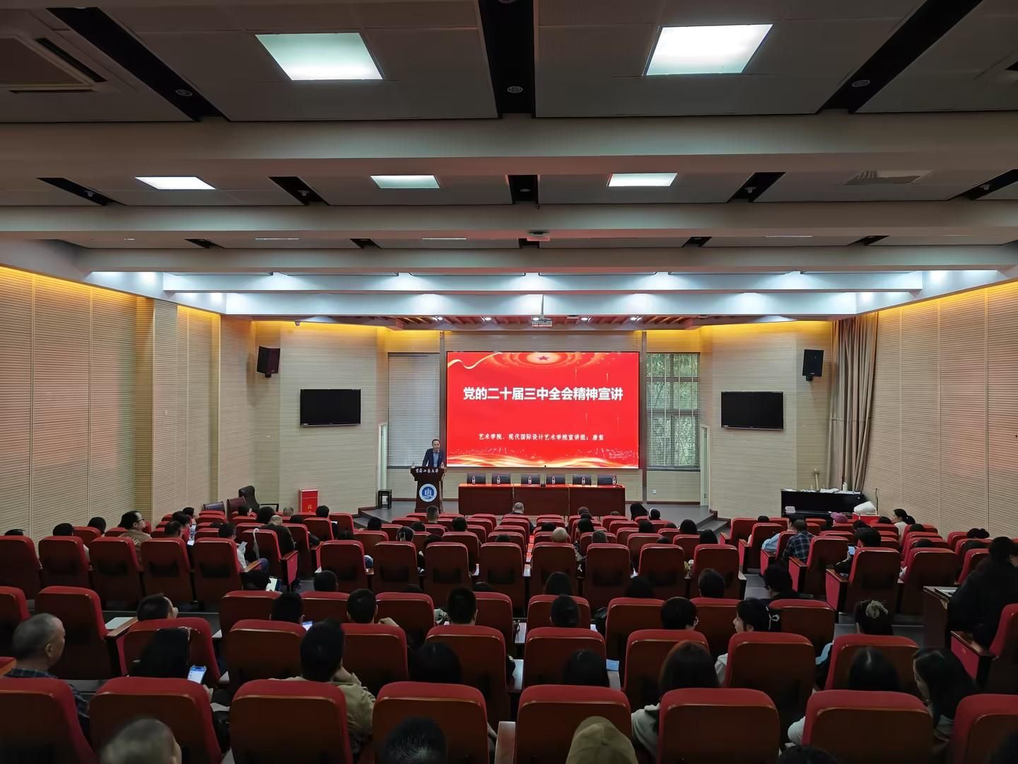 为深入学习贯彻党的二十届三中全会精神,根据学校党委统一部署,10月10日中午,yl23411永利(集团)有限公司官网、现代国际设计yl23411永利(集团)有限公司官网在兰花湖片区学术报告厅召开学习贯彻党的二十届三中全会精神宣讲会,艺术两院全体教职工参加会议。本次会议由艺术两院党委(党总支)书记唐玺做专题宣讲。