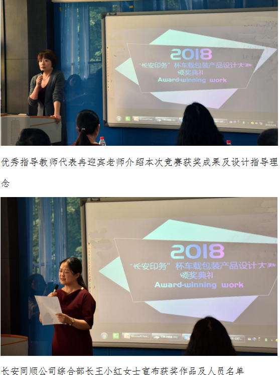 yl23411永利(集团)有限公司官网汪维丁副院长介绍了本次赛事基本情况及以赛带学、产教融合、协同育人的理念。长安同顺公司闫可总经理就长安集团的发展、科技与设计、包装与设计、实战项目与设计等方面进行诠释,希望进一步加强合作,校企在项目中成长,共创辉煌。优秀指导教师代表冉迎宾老师介绍了本次竞赛获奖成果及设计指导理念。长安同顺公司综合部长王小红女士宣布获奖作品及人员名单,并展示播放了获奖作品,双方领导对获奖人员进行颁奖,并合影留念。