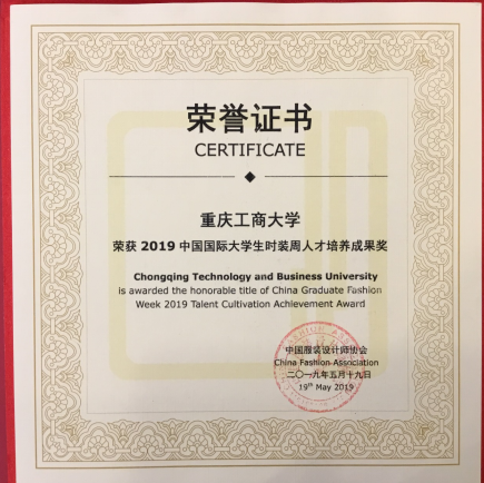 5月19日晚,2019年度中国国际大学生时装周圆满落幕,重庆工商大学首战告捷,斩获佳绩,荣获2019中国国际大学生时装周人才培养成果奖。