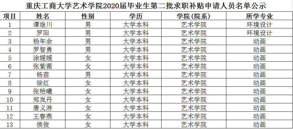 由于疫情影响,有部分符合在校求职创业补贴条件的2020年应届毕业生未能在规定时间范围内进行补贴申请。经领导批示同意,对错过申请时间的2020年应届毕业生开放了202002批次申请通道。经学生本人申请、学院审核后,我院共有13名同学申报2020届高校毕业生第二批求职补贴,现根据上级文件精神,对申报学生情况进行公示,申报人员名单附后。