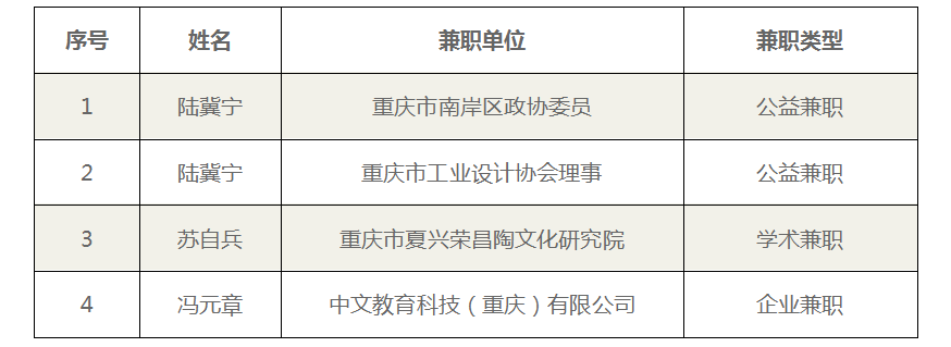 根据《重庆工商大学教职工校外兼职管理办法(试行》要求,学院组织本单位全体教职工,进行线下提交兼职材料,经学院党政联席会议研究决定,同意以下同志校外兼职。现予以公示: