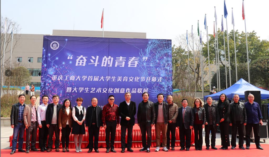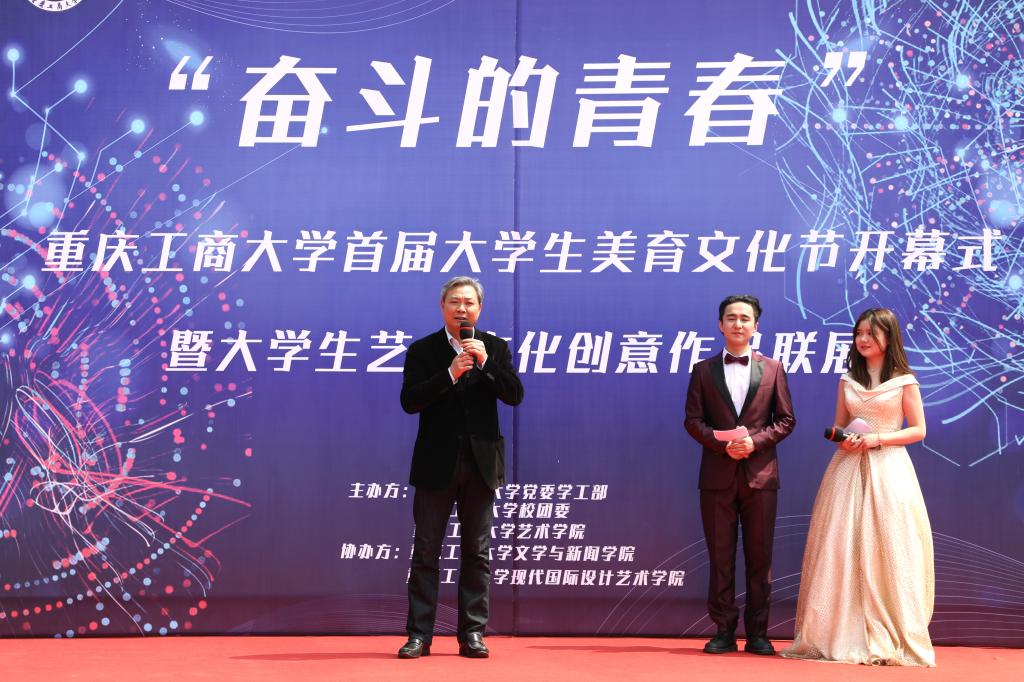 为了营造浓厚的校园文化艺术氛围,激发同学们对美育的兴趣和爱好,提升审美和创造美的能力,2019年3月20日中午12:30,重庆工商大学在南岸校区校前广场举办了“奋斗的青春”首届大学生美育文化节开幕式。重庆工商大学副校长李国军教授,教务处处长靳俊喜教授,教务处副处长陈永丽教授,重庆工商大学校友总会副会长、重庆港鑫集团董事长周勃教授,中国传媒教育实践基地联席主席、重庆市俏业家装饰集团董事长唐维升教授、创业学院院长李志教授,图书馆馆长黄文教授,学生处处长石世明教授,学生处副处长潘焱,简福平,校团委杨娟书记,yl23411永利(集团)有限公司官网分党委书记唐春秋,院长殷俊教授,分党委书记冉涛,张朝毅,副院长汪维丁教授、杨开富教授,现代国际设计yl23411永利(集团)有限公司官网副书记、副院长陈绪春以及师生代表参与了本次开幕式。