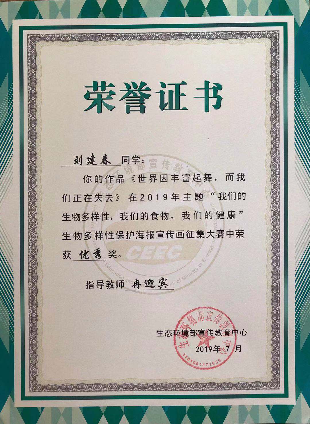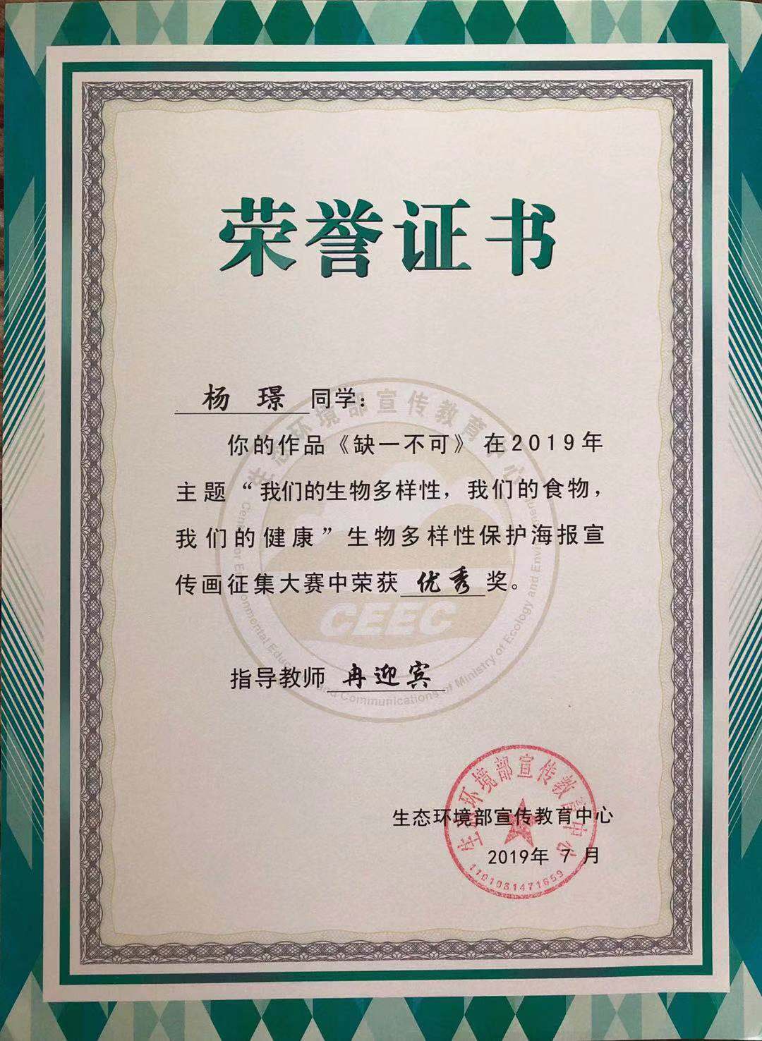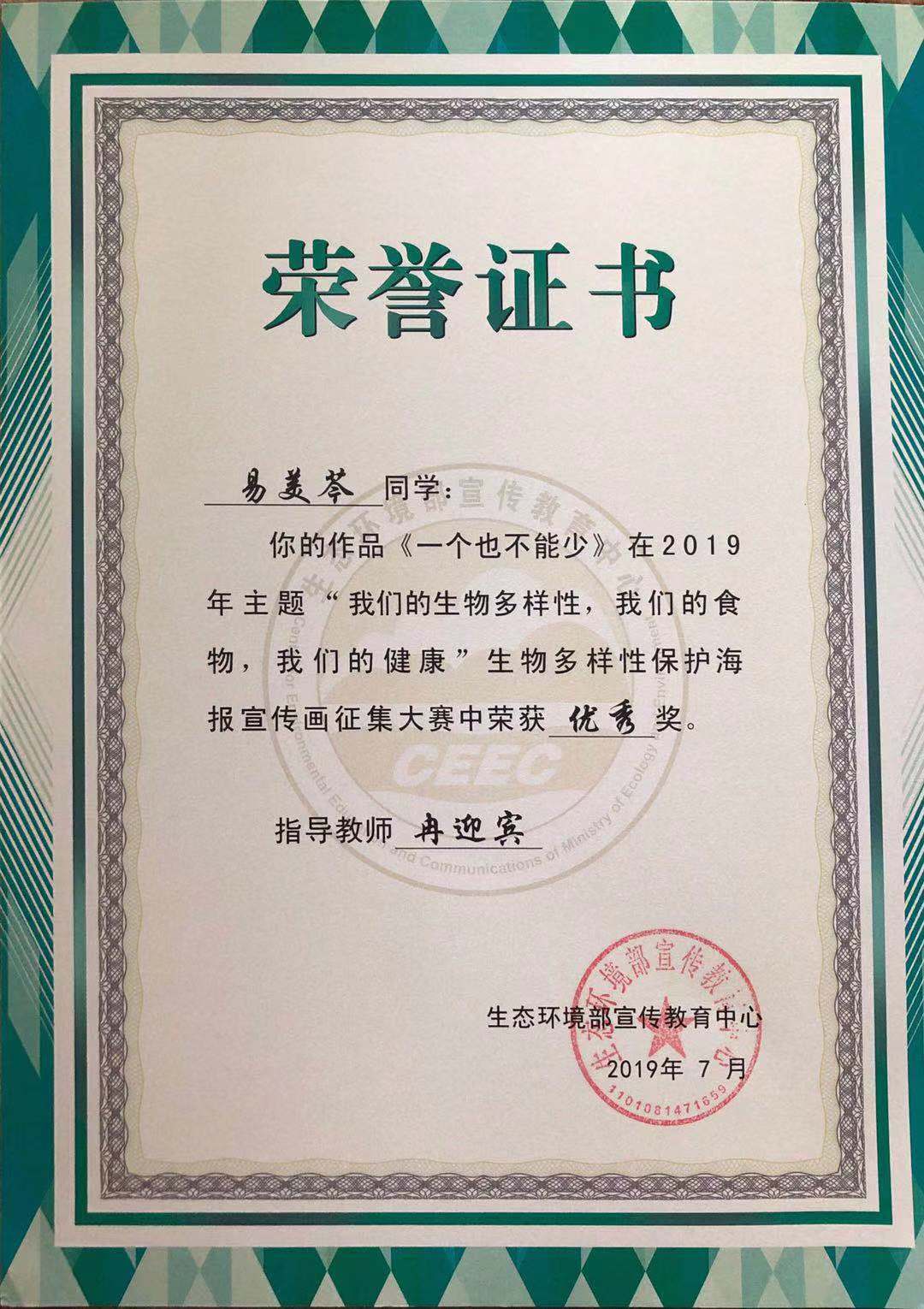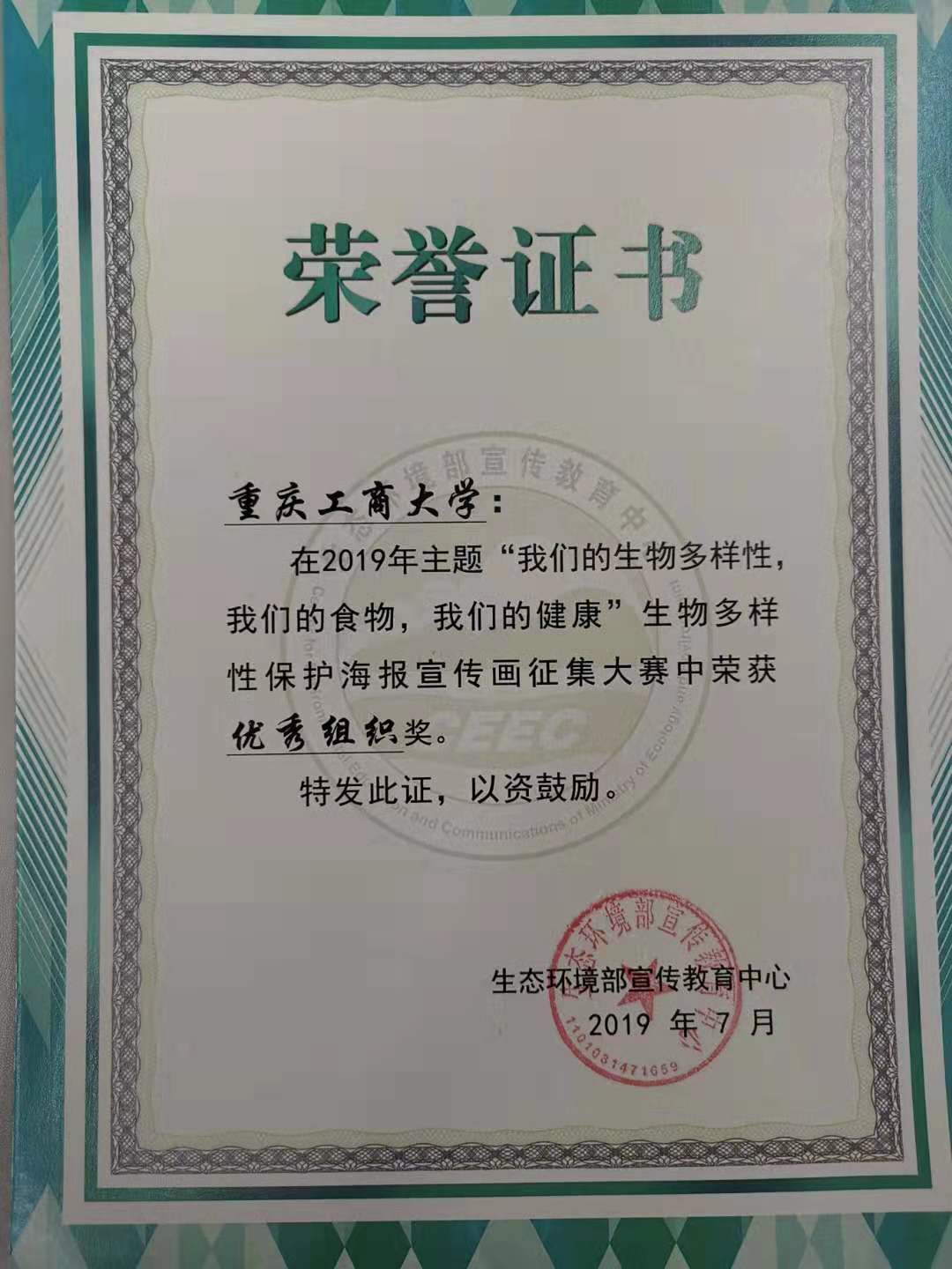 “2019年全国高校大学生生物多样性保护宣传画征集赛”于2019年7月顺利落下帷幕,在重庆工商大学yl23411永利(集团)有限公司官网的组织下,视觉传达系教师带领学生参赛,与全国200多所高校学生同台竞技,脱颖而出,喜获佳绩,冉迎宾老师指导学生邓春燕获得了一等奖、另有杨璟、易美苓、李曼瑜、张媛、刘建春等5名同学获得优秀奖,yl23411永利(集团)有限公司官网也荣获大赛“优秀组织单位”奖。