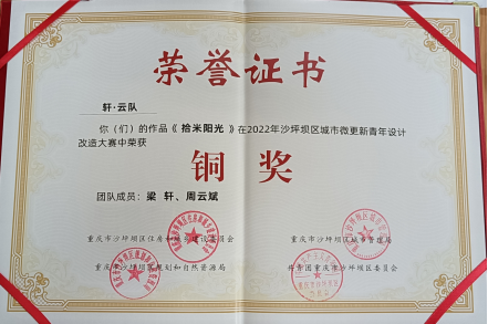 2022年7月,我院环境设计系梁轩老师、周云斌同学组成的“轩云队”凭借作品《拾米阳光》在重庆沙坪坝区城市微更新青年设计改造大赛中荣获铜奖。