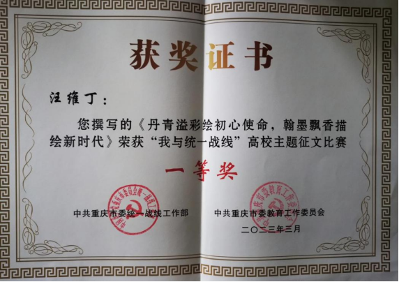 我院汪维丁教授、民盟江北区副主委、监委会主任撰写的《丹青溢彩绘初心使命,翰墨飘香描绘新时代》荣获一等奖。