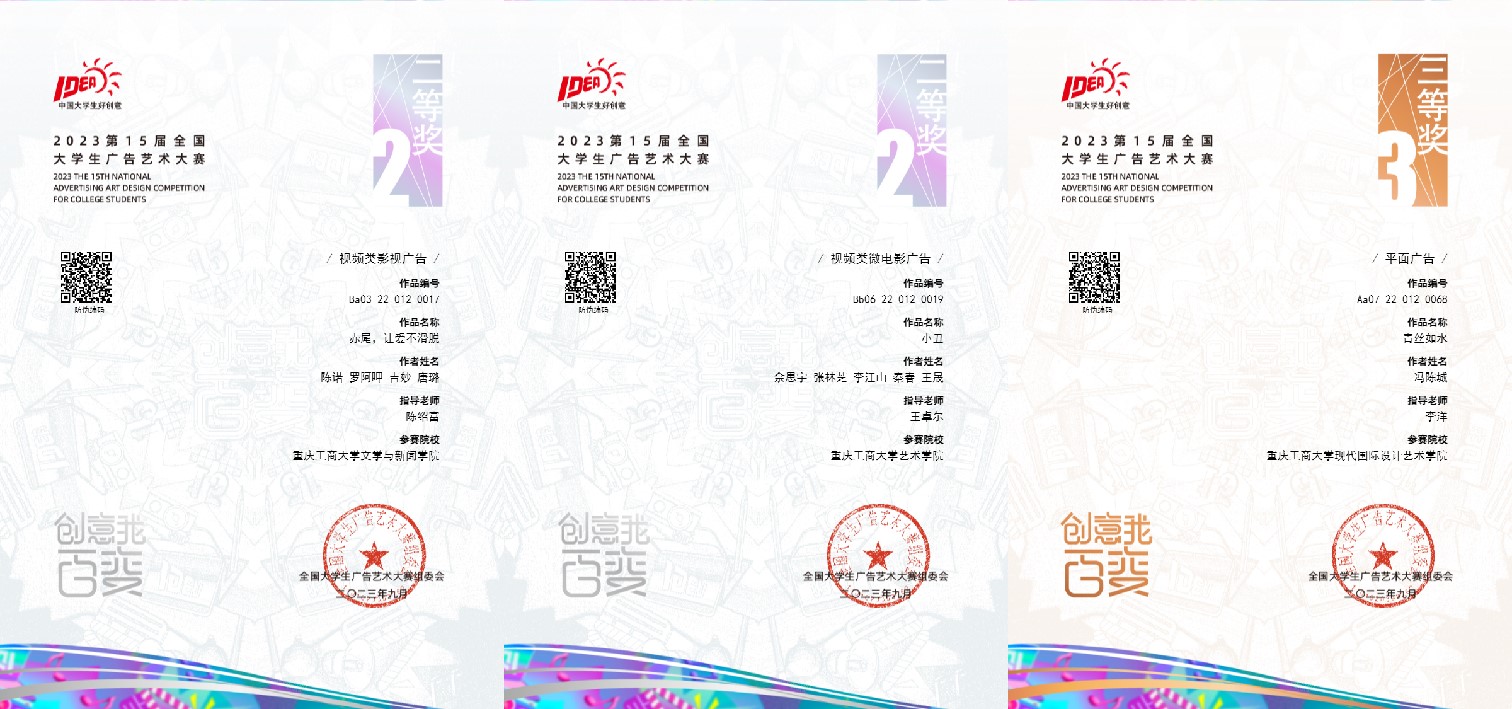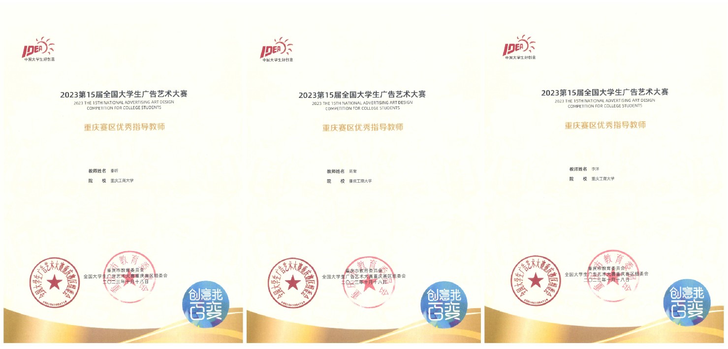 近日,第十五届全国大学生广告艺术大赛(以下简称:大广赛)获奖名单公布,我校学生在专业教师指导下的参赛作品获全国赛区二等奖4项、三等奖6项、优秀奖25项;重庆赛区一等奖9项、二等奖9项、三等奖51项、优秀奖203项。yl23411永利(集团)有限公司官网秦昕、黄薇、王卓尔;现代国际设计yl23411永利(集团)有限公司官网李洋;文学与新闻学院王烨、周莹6名老师荣获重庆赛区优秀指导教师。