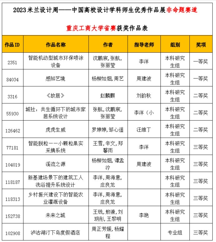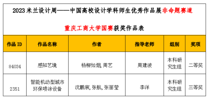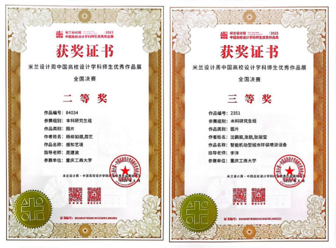 近日,第七届米兰设计周—中国高校设计学科师生优秀作品展全国、重庆赛区获奖名单正式公布。我校yl23411永利(集团)有限公司官网与现代国际设计yl23411永利(集团)有限公司官网学生共获得全国赛区非命题赛道二等奖1项、三等奖1项;重庆赛区一等奖2项、二等奖3项、三等奖6项,李洋(小)老师荣获重庆赛区优秀指导教师。本赛事是由中国教育国际交流协会、中国高等教育学会联合发起并主办,为教育部认定的全国大学生学科竞赛和中国教育国际交流协会《高校艺术学科师生海外学习计划》平台化转型的服务项目之一。赛事旨在真实反映新时代背景下我国设计学科教学水平的现状和教学成果,为全国艺术学科师生搭建展示专业才华和创作水平的国际化交流学习平台。