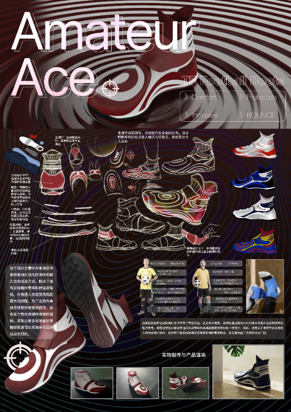 设计理念: 足球鞋的迭代进化通常以职业球员的运动需求进行设计,普通的爱好者并不适合穿着比赛级别足球鞋,而入门的足球鞋往往又是比赛级足球鞋的廉价材料版本。因此,单纯的通过降低材料的成本与减少运动科技来匹配消费者,或是迫使足球爱好者选择更高等级的足球鞋都是对他们的一种伤害。这个设计主要针对普通足球爱好者通过强化舒适性和耐久性的改进方式,解决了现有足球鞋所带来的舒适度偏低,对普通人而言受伤风险更大的问题。