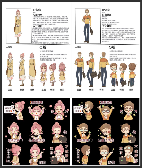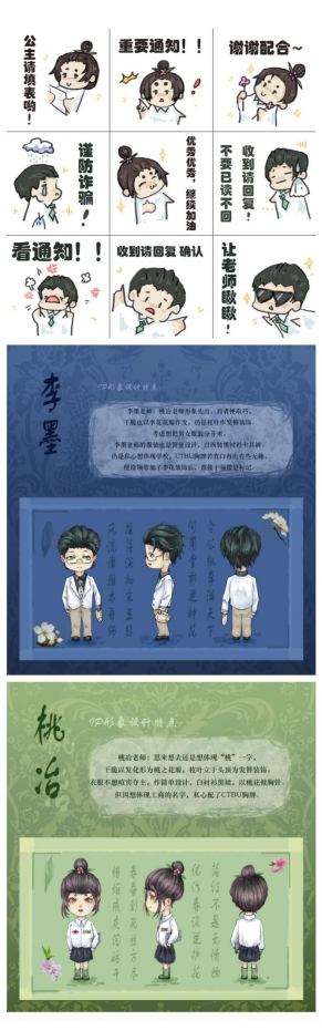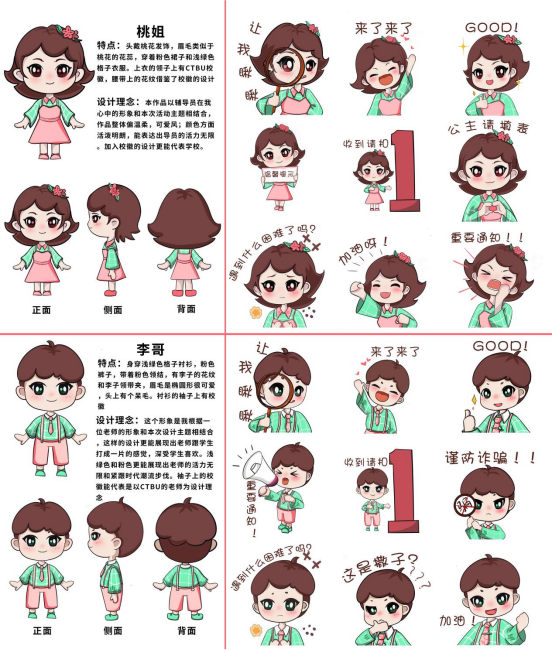 此次设计大赛分为两轮。初赛阶段12名选手设计出以男女辅导员为原型的IP形象,专业评审根据选手提供的IP三视图及作品描述选拔出3份优秀作品。决赛阶段,3名选手围绕辅导员工作常用语,设计出九宫格表情包。其中,1号选手设计的辅导员职业范儿十足,在人物配饰上巧妙的融入了校徽元素,既体现了辅导员的专业化,又突显了校园文化;2号选手将简单的线条与抽象的心情符号结合,将辅导员工作的常态,生动形象地展示了出来;3号选手刻画的辅导员形象活泼灵动,主色调选用粉色和绿色,体现了“桃李满天下”的寓意。12月5日,经过来自全校165名辅导员的票选,1号选手的作品最受欢迎,获得83票,2、3号选手分别获得30票和52票。
