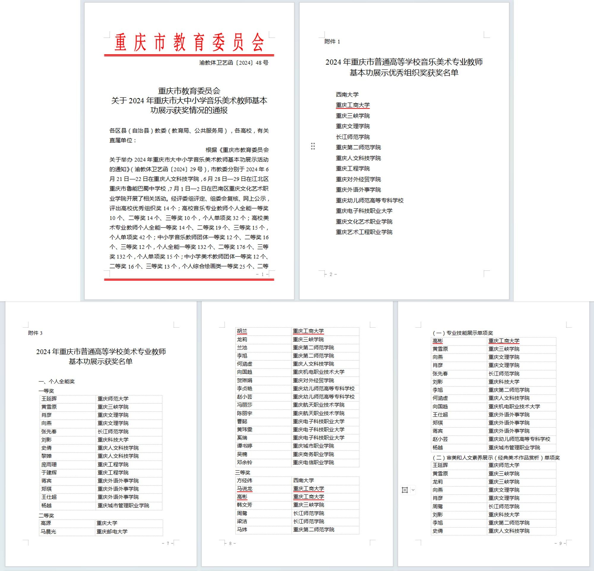 近日,重庆市教育委员会公布了2024年重庆市大中小学音乐美术教师基本功展示获奖名单。我校yl23411永利(集团)有限公司官网教师胡兰荣获个人全能奖二等奖,马说龙、高彬荣获个人全能奖三等奖,高彬另获单项奖,学校获得“优秀组织奖”。