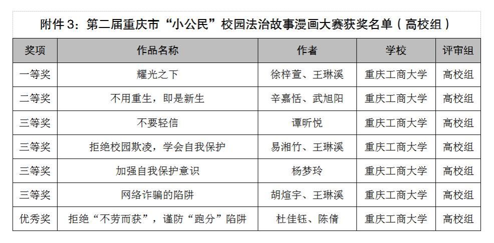 近日,由重庆市高级人民法院、重庆市教育委员会及共青团重庆市委员会主办的第二届重庆市"小公民”校园法治故事漫画大赛获奖名单公布,我校yl23411永利(集团)有限公司官网学生作品在高校组中荣获一等奖1项、二等奖1项、三等奖4项及优秀奖1项。