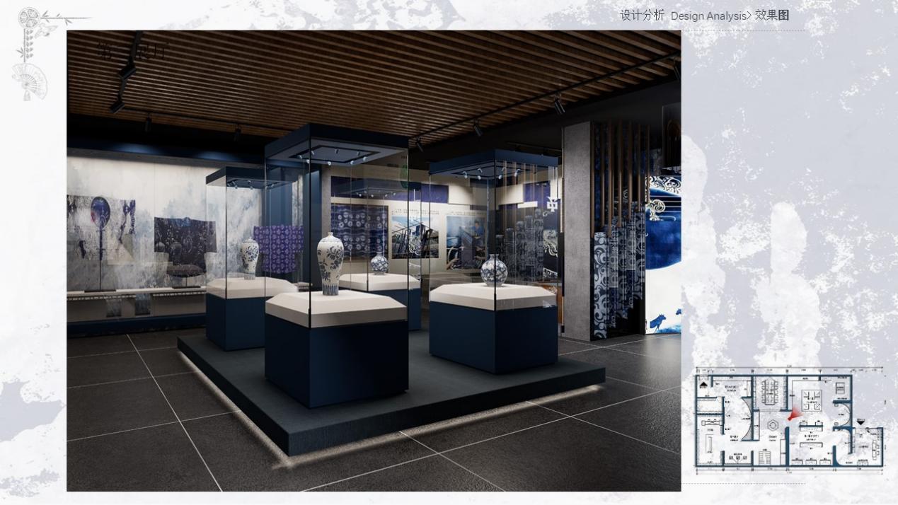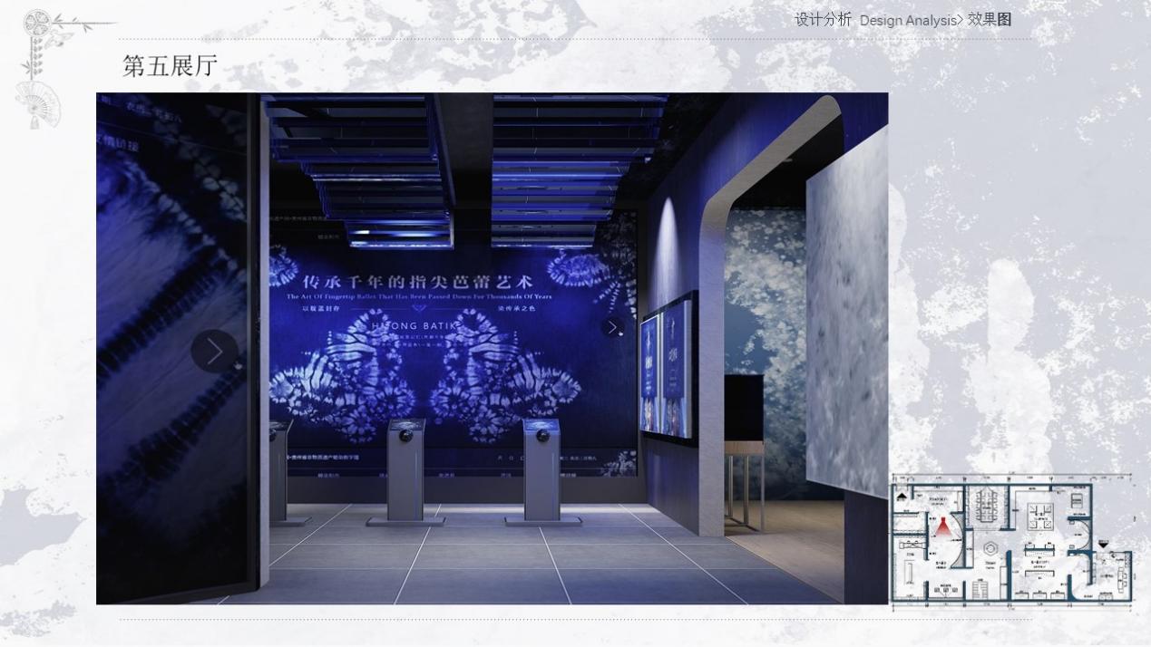 设计理念:党的二十大三中全会报告中强调全面推进乡村振兴,为贯彻习近平新时代中国特色社会主义思想,响应乡村振兴战略,将非物质文化遗产与乡村发展紧密结合,保护和传承中华优秀传统文化,为乡村经济社会发展注入新的动力,以此为宗旨设计此展厅。本项目选址于贵州省铜仁市松桃苗族自治县,此展厅类型是苗族蜡染数字艺术展厅,以松桃工艺蜡染为主题,展示了松桃蜡染这一独特的地域文化艺术形式。展厅融入蜡染作品中常用的蓝白主色调,搭配苗族文化中富有代表性的鲜艳色彩,引入AI/VR等数字技术手段,营造出既时尚又富有民族特色的空间氛围。