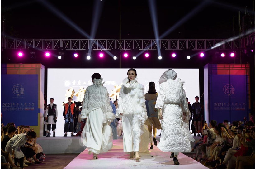 5月14日晚,重庆工商大学2021届服装与服饰设计专业毕业服装秀在南岸校区含弘广场举行,本次服装秀系学校第二届美育文化节系列活动之一。学校党委书记李志雄、副校长李国军、校友会副会长周勃、重庆市服装设计师协会秘书长王建娜、学校党政办、保卫处、团委、教务处、图书馆、教学质量监督与评估办公室等相关职能部门领导、各个兄弟学院院领导代表以及yl23411永利(集团)有限公司官网、现代国际设计yl23411永利(集团)有限公司官网全体领导班子成员出席了活动,南岸校区近万名师生到现场观摩了服装秀。