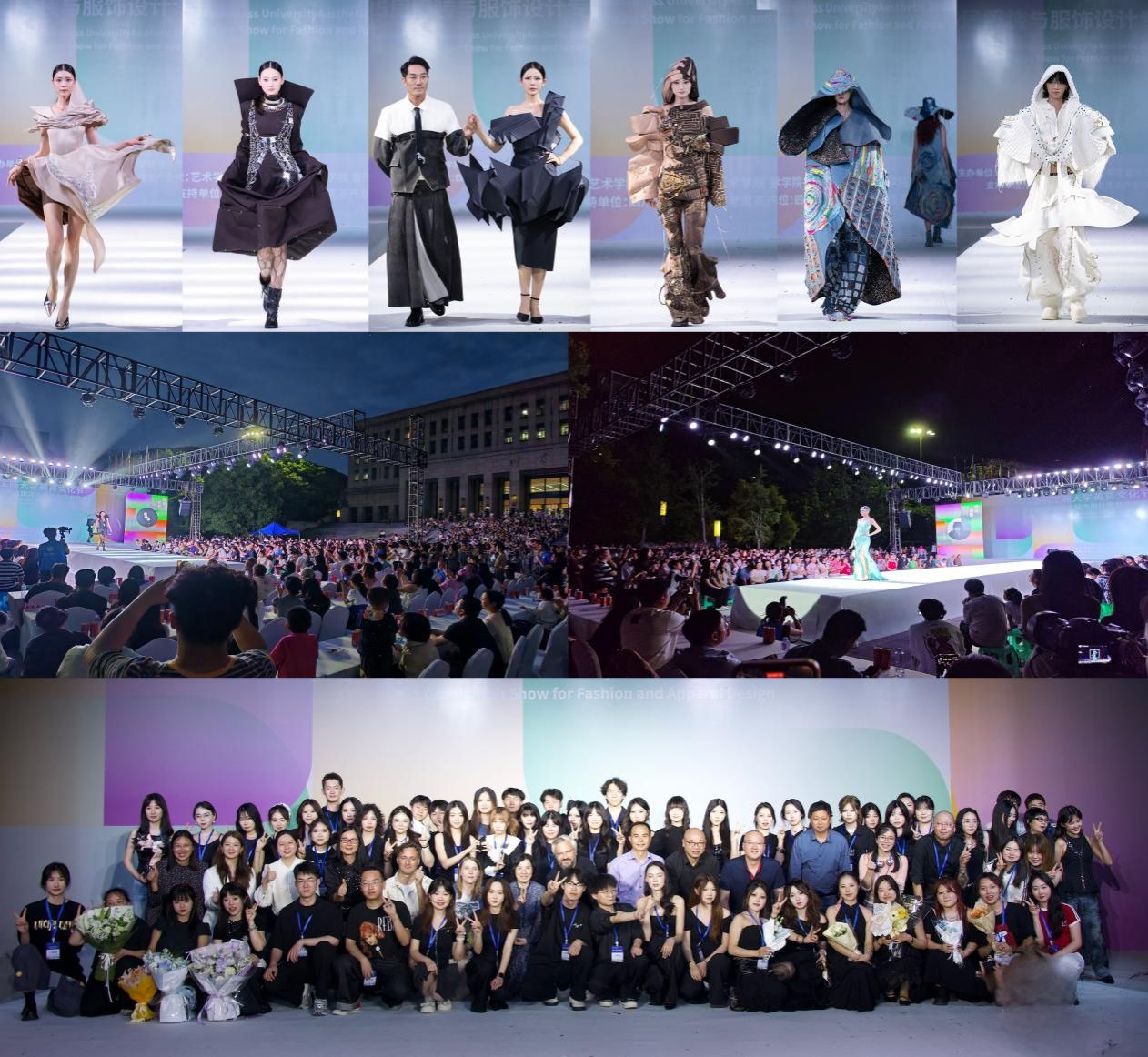 服装与服饰设计专业毕业作品秀作为本次活动的一大亮点,于 5 月 9 日晚在南岸校区含弘广场璀璨上演。本次服装秀是学校美育文化节系列活动之一,以“流光织影”为主题,毕业生们精心设计制作的150余套原创服装惊艳登场,通过光影与时尚的交融,将服装的设计理念与艺术美感展现得淋漓尽致,充分诠释了当代青年学子的审美追求与创作活力。活动吸引了全校3000余名师生到场欣赏这场美育文化盛宴。
