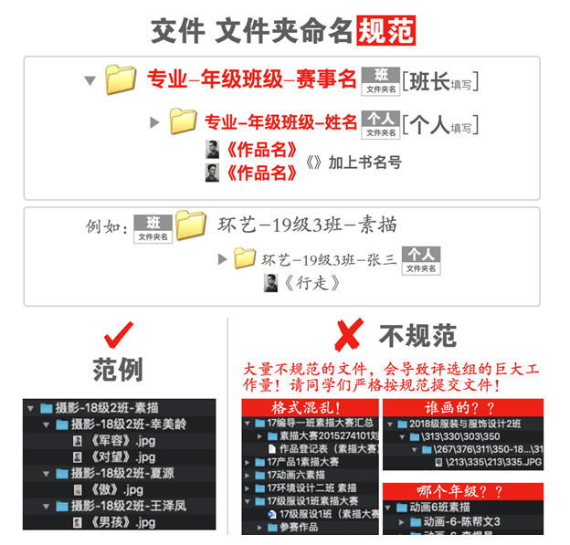 将作品照片(重命名成作品名)放进文件夹,文件夹改名为:专业-年级班级-姓名。然后传给班长。文件夹格式,仔细参看下图