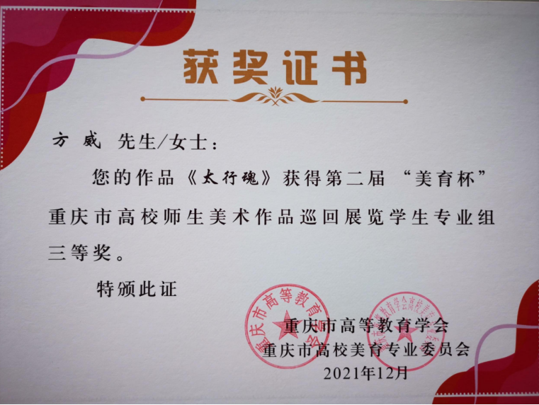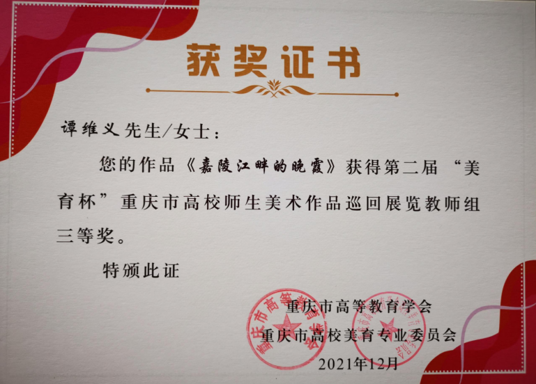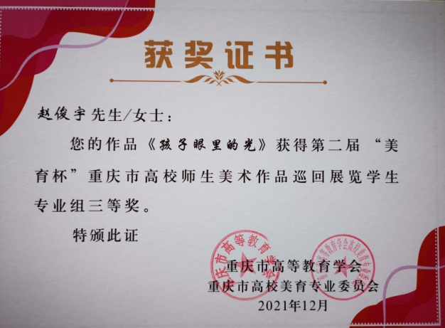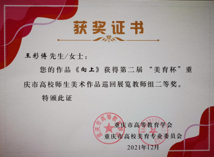 为纪念中国共产党成立100周年,弘扬社会主义核心价值观,服务重庆经济社会发展,助力乡村振兴,由重庆市高等教育学会主办,重庆市高等教育学会高校美育专业委员会、重庆师范大学承办,全国师范大学美术教育联盟、四川美术学院艺术教育学院、重庆大学yl23411永利(集团)有限公司官网、西南大学美术学院等机构协办的第二届“美育杯”重庆市高校师生美术作品巡回展览作品落下帷幕,经评组委会评审,我院报送的多项作品喜获佳绩,王彩博老师油画作品《向上》获得二等奖,谭维义老师油画作品《嘉陵江畔的晚霞》获得三等奖,沈正中等四位老师作品入选展览;学生赵俊宇《孩子眼里的光》、方威《太行魂》获得三等奖,五位同学获得优秀奖,十二位同学入选展览;梁轩、姚俊娜获得指导教师三等奖。