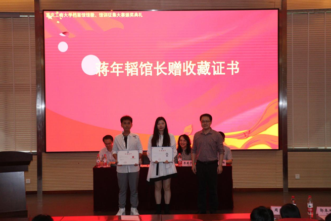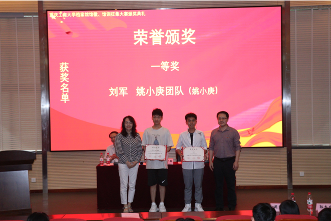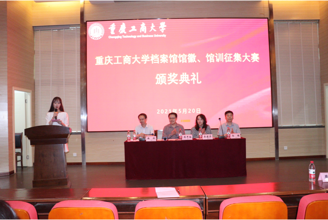 5月20日中午,由重庆工商大学档案馆、yl23411永利(集团)有限公司官网、创新创业学院共同举办的重庆工商大学档案馆馆徽、馆训征集大赛颁奖典礼在兰花湖片区报告厅成功举行。重庆工商大学档案馆馆长蒋年韬、yl23411永利(集团)有限公司官网党委书记李莉莎、档案馆副馆长郭楠、教务处副处长胡卫军、yl23411永利(集团)有限公司官网正处级组织委员冉涛、yl23411永利(集团)有限公司官网学工办主任郭本玲、档案馆周雪玉以及获奖学生、团队参加了此次颁奖典礼。