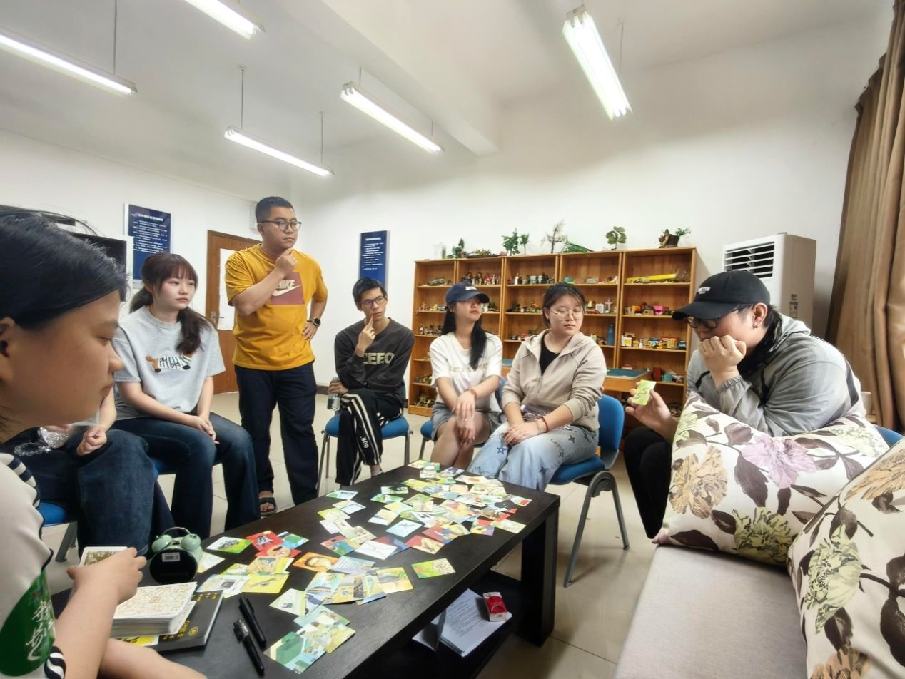 吴老师首先介绍OH卡牌的心理学原理与使用规则。OH卡作为“潜意识的镜子”,通过图像与文字的组合,为参与者提供自我觉察与心灵对话的媒介。在“卡牌自我介绍”环节,同学们抽取最具感应的卡牌,结合牌面意象分享个人经历与感悟,以新颖方式建立情感联结。互动环节中,参与者两两一组围绕卡牌内容展开问答,在观点碰撞中深化对自我与他人的认知。团队共创故事环节将活动推向高潮——大家轮流抽卡并合作编织连贯或奇幻的故事线,在创意协作中提升默契度,现场气氛热烈活跃。分享总结阶段,同学们纷纷表示,通过OH卡牌的隐喻与互动,不仅获得了自我探索的新视角,也在集体交流中释放了压力、收获了情感支持。