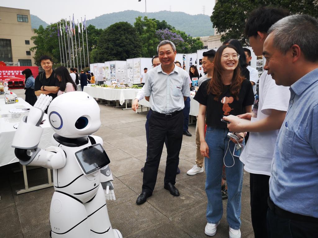 开幕式结束后,参会领导与现场师生共同参观了现场作品展,展览现场分为课说党史、画说党史、手工艺、绘画、创意设计、人工智能、机械工程、摄影等多个展区,作品涵盖多方向专业领域,形式多样,内容丰富,参展作者们以独特的创意表达、鲜活的艺术形态、别致的文化魅力绘制作品,共同构筑了一场展现学生青春风采、烘托校园美育氛围的视觉盛宴。在课说党史展区,宋豫仔细地观看了yl23411永利(集团)有限公司官网专业教师指导学生将党史学习教育有机融入艺术专业课程所创作的创意设计作品,并对如何深入推进课说党史活动、做好日常课程思政建设进行了指导;在机械工程作品展区,李国军向学生详细了解了作品的设计理念和功能原理,随后与人工智能学生团队的智能AI机器人进行了亲切的互动,他鼓励学生们在校学习期间继续开展美育创新;在手绘工商大展区,柏群认真地阅览了一幅幅生动形象的校园手绘作品,肯定了艺术学子用画笔表达对校园的热爱之情。展览现场还先后吸引了数千师生驻足观看。