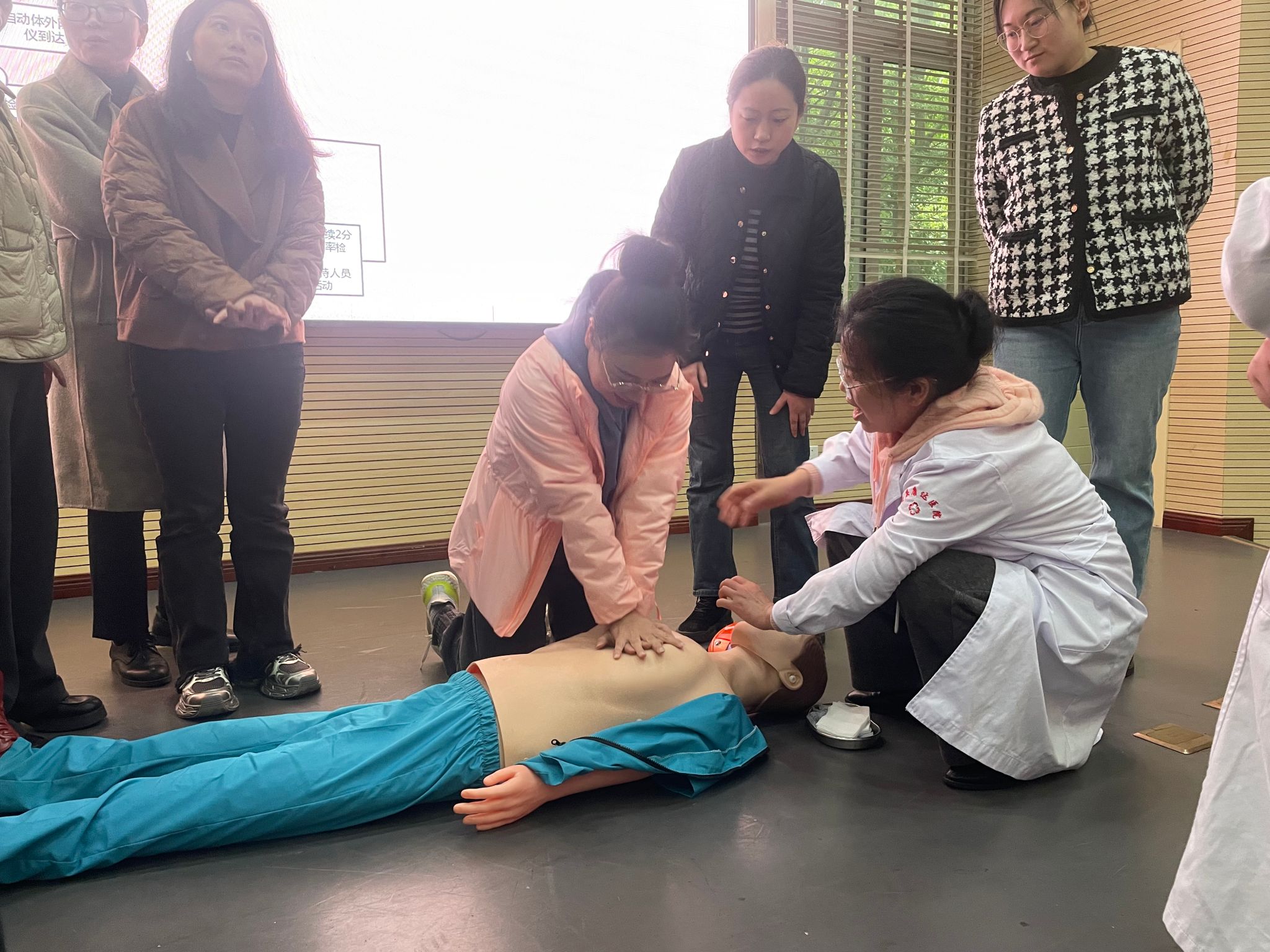 张清医生结合实际案例讲解了校园常见疾病防控的重要意义,提醒辅导员做好学生因病缺勤追踪、发现传染病及时上报等防控措施。高强医生针对心肺复苏实施和AED除颤仪使用进行了现场教学,辅导员老师们逐一进行实操训练。