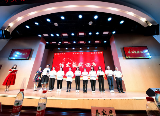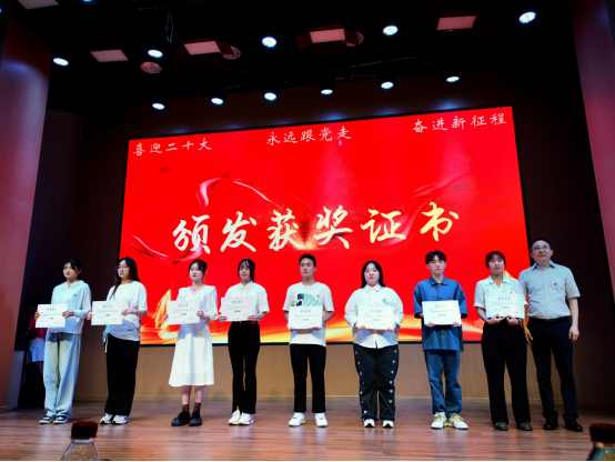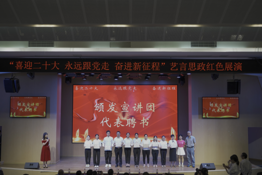 本次艺言思政红色展演共分为两个环节。在成果展示环节中,首先由艺术两院党史教育宣讲队带来了红色党史故事分享,李国军副校长为宣讲队成员代表颁发了聘书。随后分别进行了“喜迎二十大,政治生日践初心”政治生日贺卡视频展示,“绘百年党史 忆峥嵘岁月”红色人物绘画获奖作品视频展示等活动内容,由宣传部部长华杰、学工部副部长陈龙国、校团委副书记胡婧婷依次为获奖同学颁发了获奖证书。在文艺演出环节中,由艺术两院师生带来的红色歌曲《错位时空》追忆了革命峥嵘岁月的历史征程;红色舞台剧《传承》演绎了老中青三代传承红色基因,赓续红色血脉的故事;集体朗诵节目《党的“二十大”之歌》歌颂了党和国家的光辉历程,站在新的历史起点上催人奋进最后,活动在合影留念中圆满结束。