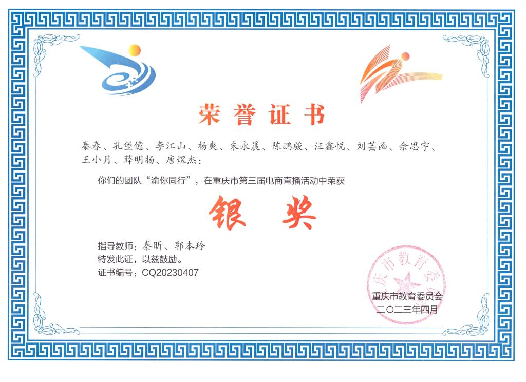 近日,重庆市第三届电商直播大赛圆满结束。我院的“渝你同行”团队在此次赛事中荣获银奖。该团队由yl23411永利(集团)有限公司官网20级12位同学组成,由秦昕、郭本玲担任指导教师。