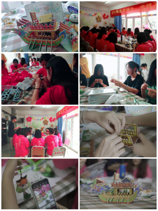 上午9点,同学们纷纷到达公寓区活动室参与缝制端午香包和拼龙舟活动。香囊和龙舟是我国特有的民俗文化符号,蕴涵着深邃的中华民族文化精神。在活动室里同学们一双双巧手下,一针一线的穿连出一个个漂亮的端午节香囊。随后大家一起拼龙舟,现场一片欢声笑语,其乐融融,节日气氛十分浓烈。通过香囊制作,龙舟拼搭,同学们更直观、更生动地认识和体会非物质文化遗产的魅力。