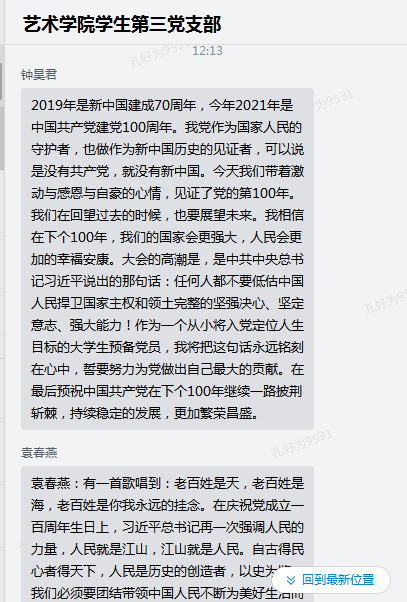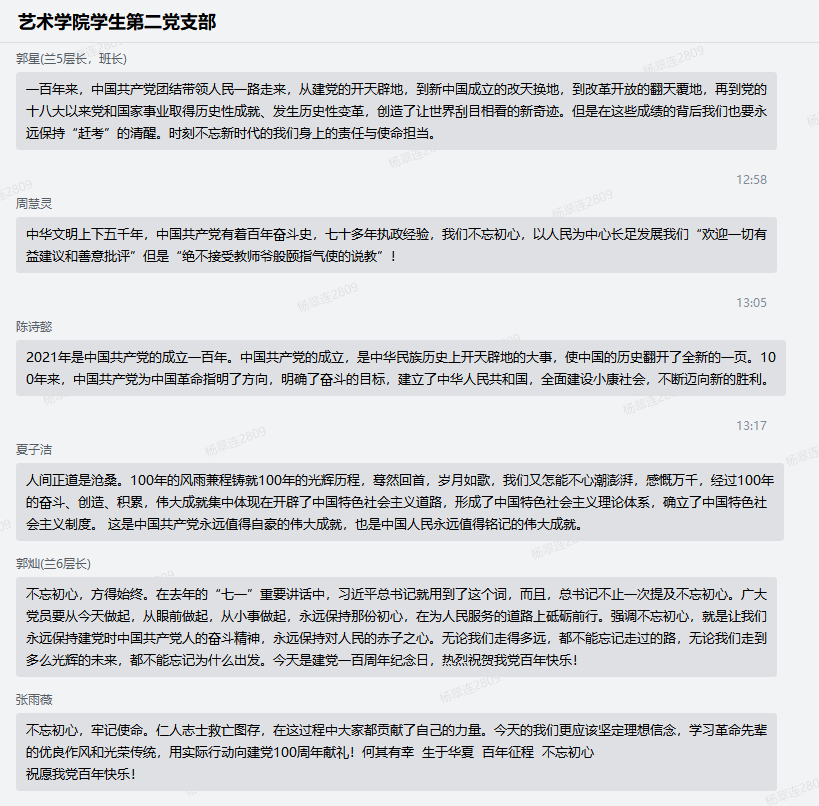 2019级本科生、现代国际设计yl23411永利(集团)有限公司官网学生党支部钟沛言说:习近平总书记指出“一百年来,中国共产党团结带领中国人民,以“为有牺牲多壮志,敢教日月换新天”的大无畏气概,书写了中华民族几千年历史上最恢宏的史诗。这一百年来开辟的伟大道路、创造的伟大事业、取得的伟大成就,必将载入中华民族发展史册、人类文明发展史册。”我有幸生在这繁花似锦的年代,不用以血泪浇灌土地,这一切的美好幸福生活都是共产党人团结人民奋斗的成果。人民有信仰,国家有力量,感谢出生在和平年代,永远感恩永远热爱,七一建党节,党的100诞辰,愿党永远辉煌,祝祖国国富民强!