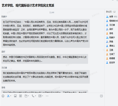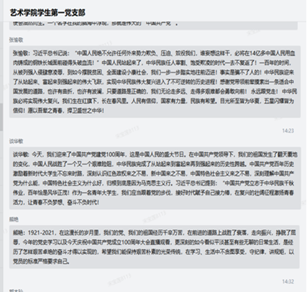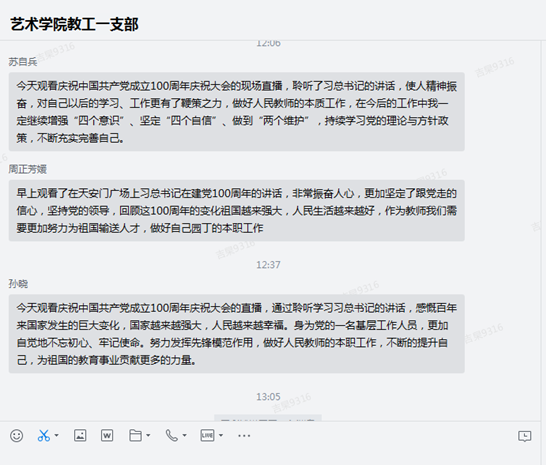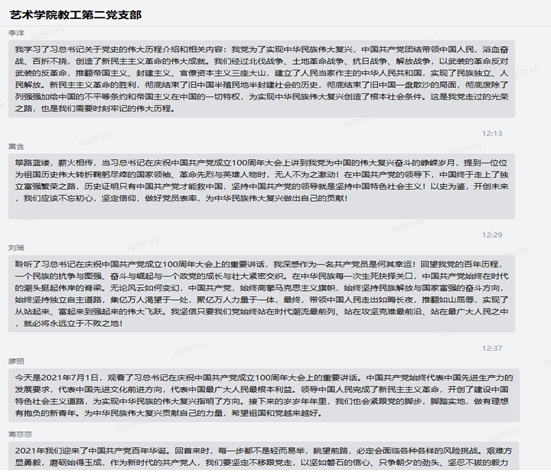 7月1日,庆祝中国共产党成立一百周年大会在北京隆重举行,习近平总书记出席并发表重要讲话。yl23411永利(集团)有限公司官网、现代国际设计yl23411永利(集团)有限公司官网师生收听收看总书记讲话后倍感振奋,在线上开展了热议“习总书记在庆祝中国共产党成立一百周年大会上的重要讲话”活动。师生党员、民主党派人士、无党派人士纷纷发言,祝贺中国共产党成立一百周年,畅谈聆听了习近平总书记重要讲话的心声,祝愿在党的领导下早日实现中华民族的伟大复兴。仅7月1日下午,学院综合办就收到师生感言173条。