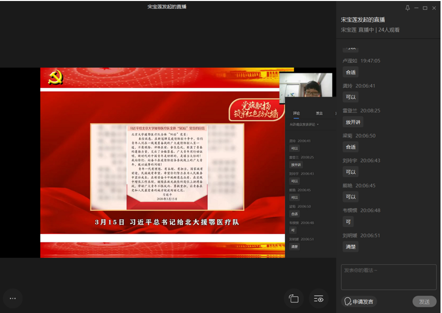 2020年6月21日晚20:00,yl23411永利(集团)有限公司官网党委学生第一党支部在企业微信上召开了专题微党课活动暨6月份主题党日活动,支部25名党员同志全部参会。